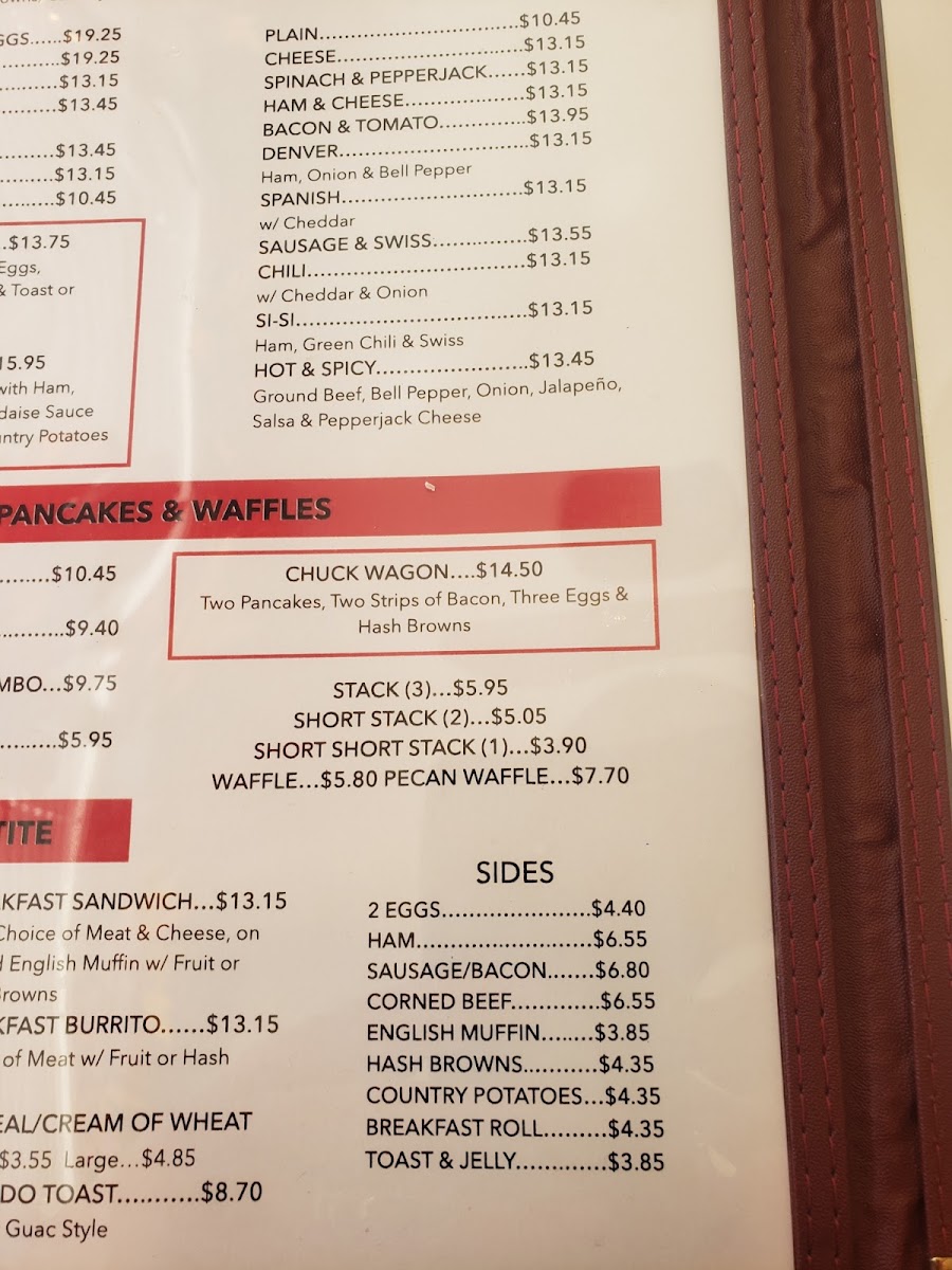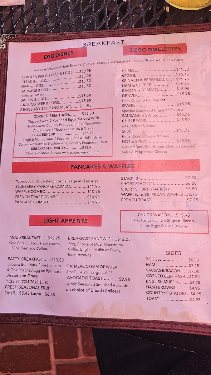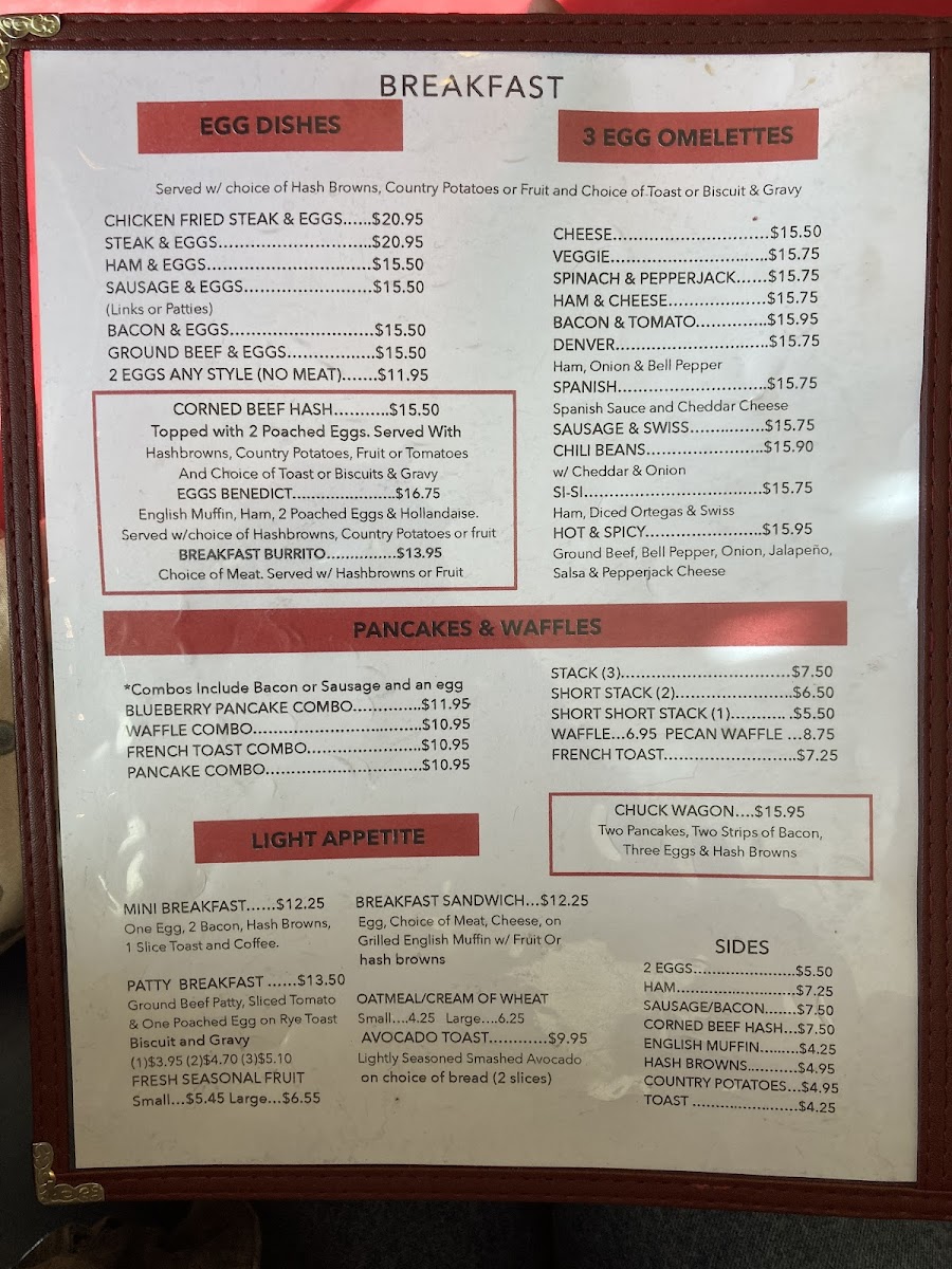 - Breakfast and Combo Plates: Items including Pancake Combos, Country Fried Steak, Chicken Fried Steak & Eggs, Omelettes with biscuits and gravy, and Corned Beef Hash are available for morning meals.