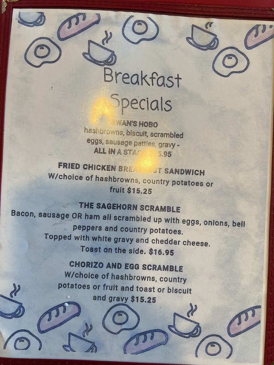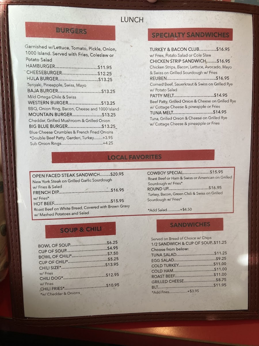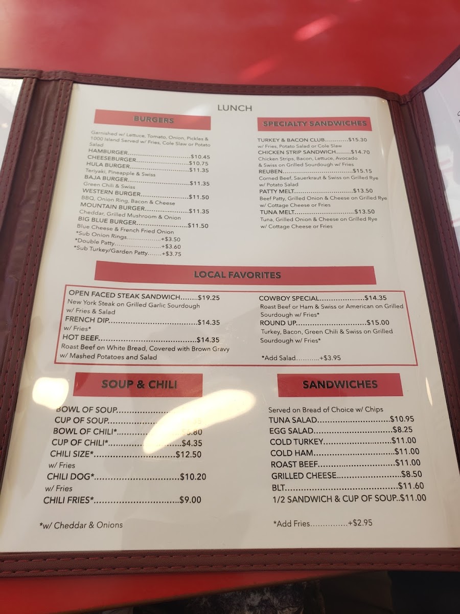 - Local Favorites: Entrées featuring traditional diner dishes like the Open Faced Steak Sandwich, French Dip, Hot Beef, and Cowboy Special.