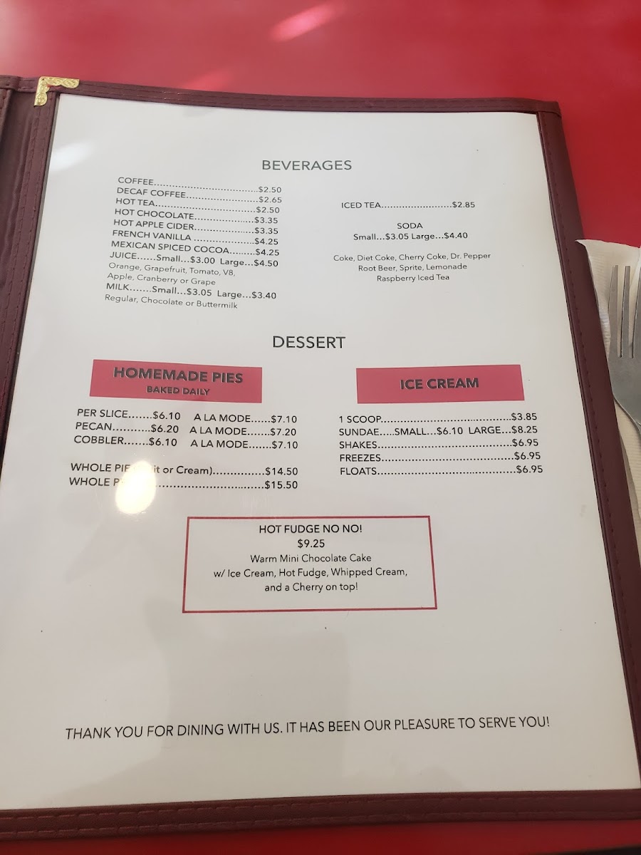 - Desserts: Includes traditional diner-style desserts such as Cherry Pie A La Mode, Key Lime Pie, Lemon Drop Pie, and cobblers.